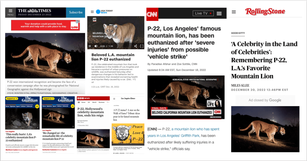 There has been widespread coverage of P22’s death by euthanasia following being hit by a car in the Hollywood Hills. But P22 did not die in vain, as he is an ambassador for urban wildlife, the importance of habitat connectivity and co-existence with our wild creatures. You can hear his incredible story in The Cat That Changed America.